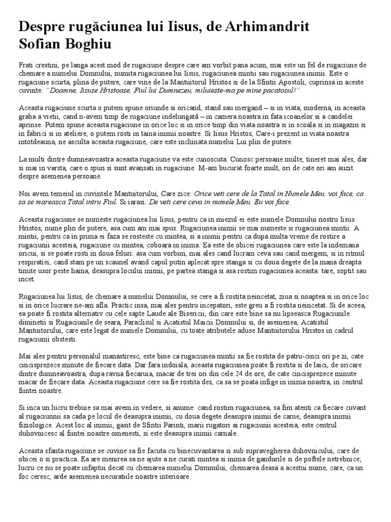 Doamne iisuse hristoase, fiul … Doamne mă bucur pentru bunătatea cu care pe toți ne întâmpini de fiecare data întinzând ce ai tu și punând în fața noastră , la masa noastră, roadele bucuriei tale. Este rugaciunea curata, rugaciunea intregii fiinte care manifesta iesirea emotionala in afara lucrurilor, in afara gandurilor, in afara sinei proprii, spre intalnirea cu dumnezeu. 22.06.2015 · este vorba de o expresie dincolo de cuvinte. In inima intreaga fiinta este proiectata in dumnezeu cu o iubire nesfarsita.